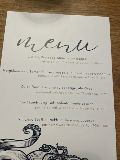 Today we had the 5 course A la ca meal. We started with garlic and rosemary freshly made bread roll with an olive oil and chilli pieces dip. Rolls were delicious but I’d prefer butter to oil. Partner enjoyed oil dip. First course was oysters with caviar. I don’t eat oysters and either does my partner so we didn’t have them , but those around us that did seemed really enjoy them. Second course was a tamarillo , roast pepper, fresh mozzarella salad. This was my favorite dish of the day. Very light and fresh. Third course was quail and cabbage. Quail was cooked lovely and very nice, cabbage had a lovely sauce/ dressing but again a lot of olive oil. Still a lovely dish. Fourth course was a lamb rack on polenta with a bushman’s sauce. The lamb was cooked to perfection and the rest of the meal was also quite nice. And to finish off the meal we had a tamarind soufflé with a jackfruit ice cream. Unfortunately we both found it overly sweet and left a strong taste in our mouths . Not a favorite of ours at all. As for the staff and service I would give them a 10/10. They were always close by ready to serve but not in your face, cleaning dishes, offering drinks, giving you clean cutlery after each dish. Polite and willing to help in any way they could. The restaurant itself was inviting, clean and comfortable. We would definitely recommend and...