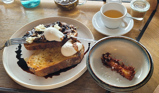 Just ate at Newfolk for the first time. We got there at 11 and ordered our food and drinks as soon as the wait staff came to us. We ordered a green tea, which was nice, and a flat white that was pretty horrible and on the bitter side.