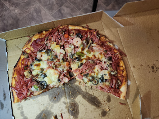 got takeaway pizza delivered to motel. Meat Lovers had few pieces of chicken, couple bits of salami and lots of shredded ham. Not much taste but ate it cos hungry ..... left some of it. First time we ever got a pizza that was not cut into pieces so used a butter knife to try and cut it. Won't get...