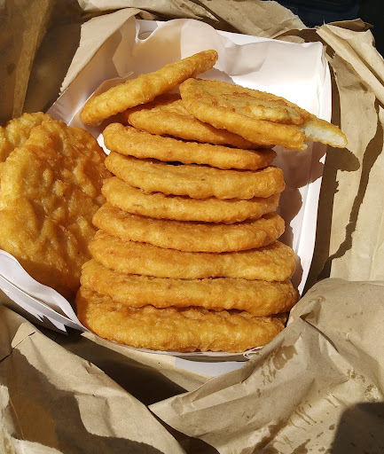Really ordinary potato cakes. They were translucent. When you can see through a potato cake you know the potato has been sliced thinner than shaved ham! Two stars only because the batter was crispy and I love it crispy. This is an update - I wish I had taken a photo of the thinnest potato cakes ever from a place that calls itself "gourmet". I'm also changing the review to one star because the only reason the batter was crispy was because they had been overcooked in the first place anyway. They were incredibly bad and because it calls itself a "gourmet" shop, they cost more - $1.50 each!! I just had a feeling about the place when I noticed that a small serve of hand cut chips was $7.50. (Hand cut? What difference does that make anyway, other than it means you can up the price?) So I baulked at that and went to a takeaway burger place around the corner and ordered probably machine cut chips, small size which cost $5.00. Very wise decision. I thought I would post a photo of a real potato cake from a traditional fish & chip take away joint I went to last Thursday and the Thursday before that. And upholds that tradition by giving you an extra two when you order a dozen!! I will keep going back there but never again will I venture into a gourmet fish and (give me a...