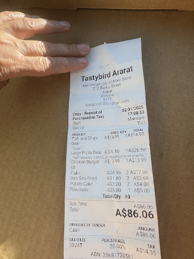 Read moreFirstly I love my food secondly I made a big order as the family and I were starving I bought a chicken burger with the lot was fake processed chicken like patties from Woolworths half a slice of tomato one tiny peace of bacon slice of beetroot far from burger with the lot fish and chip were dry the potato cakes were like concrete asked for a half half pizza with the lot and got ham cheese capsicum onion pineapple and that’s it pizza no flavour very bland and rude to the the customers if I could give this zero stars I would and also like a sauna in the store HIGHLY RECOMMEND TO STAY AWAY AND SPEND MONEY ELSEWHERE ON...