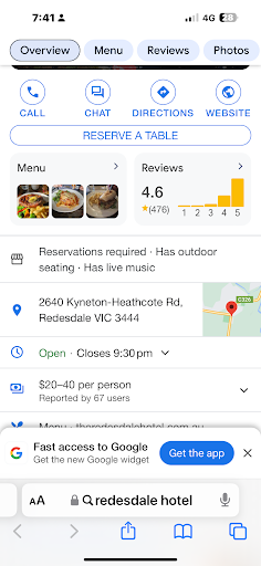 Read moreWe are locals and On Sunday 16th June we called the Redesdale Hotel to make a booking and check they were open. The message said they would be closed for a family funeral for a week at the end of May. The website is showing âOpenâ on Sunday the 16th June 2024. We make the 15k trip to find that the hotel IS CLOSED. ????? So we head to Kyneton for a meal but about one and a half Km out of Redesdale, in the pitch black darkness, we hit a sheep on the Heathcote - Kyneton Road at some speed. The car is damaged and requires significant repair. If the website and phone message had been up to date, this all could have been avoided. The management should be accountable for the lack of accuracy on the website and message. Very...