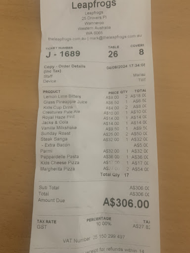 Read moreMy family and I had an absolutely unforgettable evening at Leapfrogs for our daughter’s 18th birthday dinner, and I can’t praise this restaurant enough! From the moment we walked in, the staff welcomed us with genuine warmth and enthusiasm, setting the tone for a truly special night. Their attentiveness and professionalism were outstanding, ensuring every detail was perfect without ever feeling overbearing. A special shoutout goes to Lucinda, whose flawless and friendly service elevated our experience to another level. Her bright smile, thoughtful recommendations, and impeccable timing made us feel like VIPs. She checked in just enough to keep everything seamless, all while radiating kindness that made the evening even more memorable. The food was nothing short of spectacular. We all ordered the Lamb Shanks with Mashed Potato and Jus, and it was a unanimous hit. The lamb was melt-in-your-mouth tender, perfectly complemented by the creamy mashed potatoes and rich, flavorful jus. Every bite was a reminder of the care and quality Leapfrogs puts into their dishes. Thank you, Leapfrogs, and especially Lucinda, for making our daughter’s milestone birthday so extraordinary. Your exceptional staff and phenomenal food turned a special occasion into a night we’ll cherish forever. We can’t...