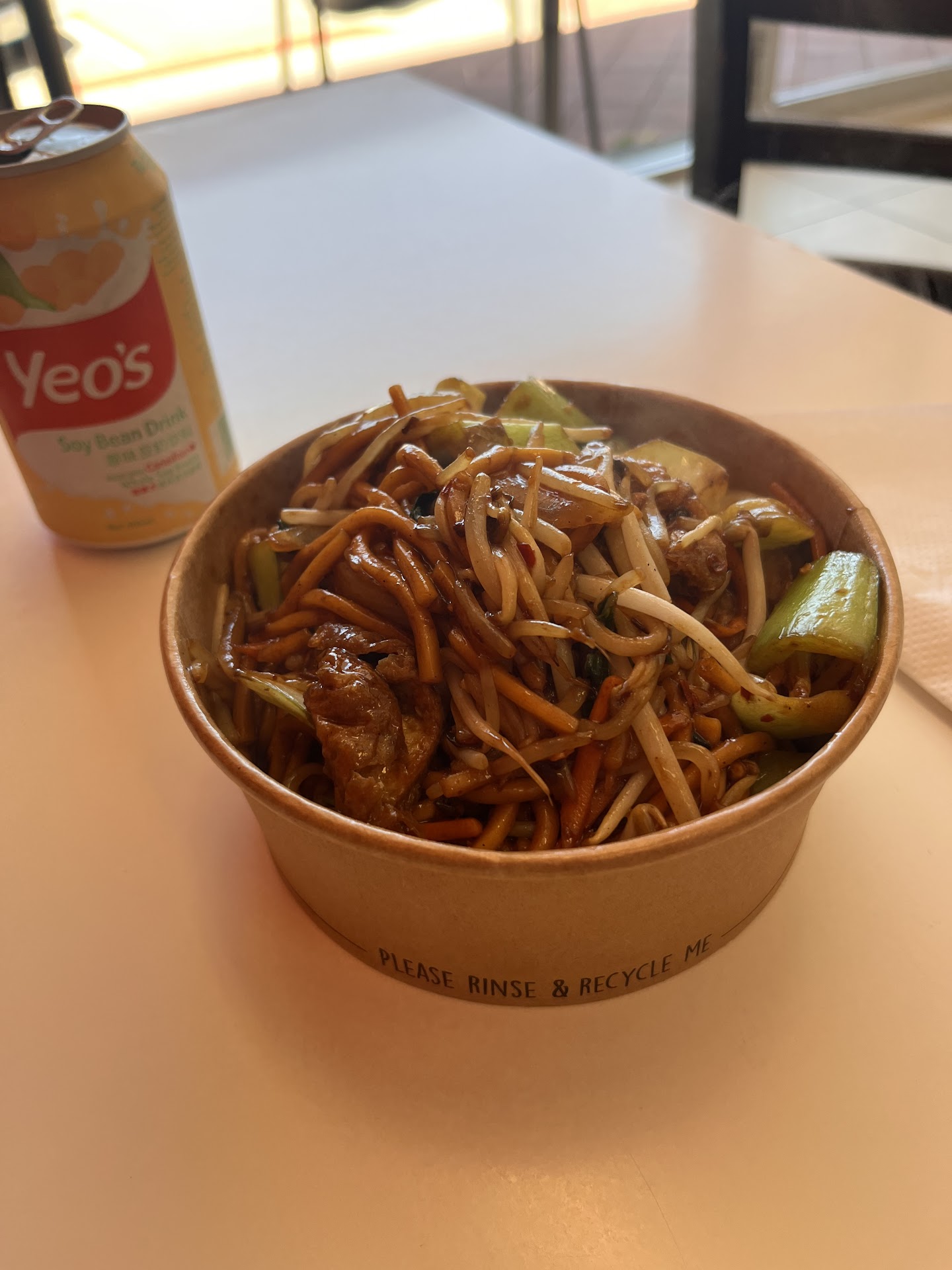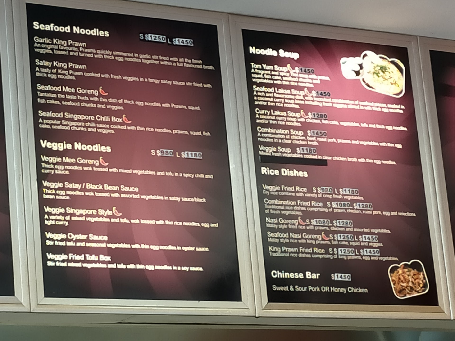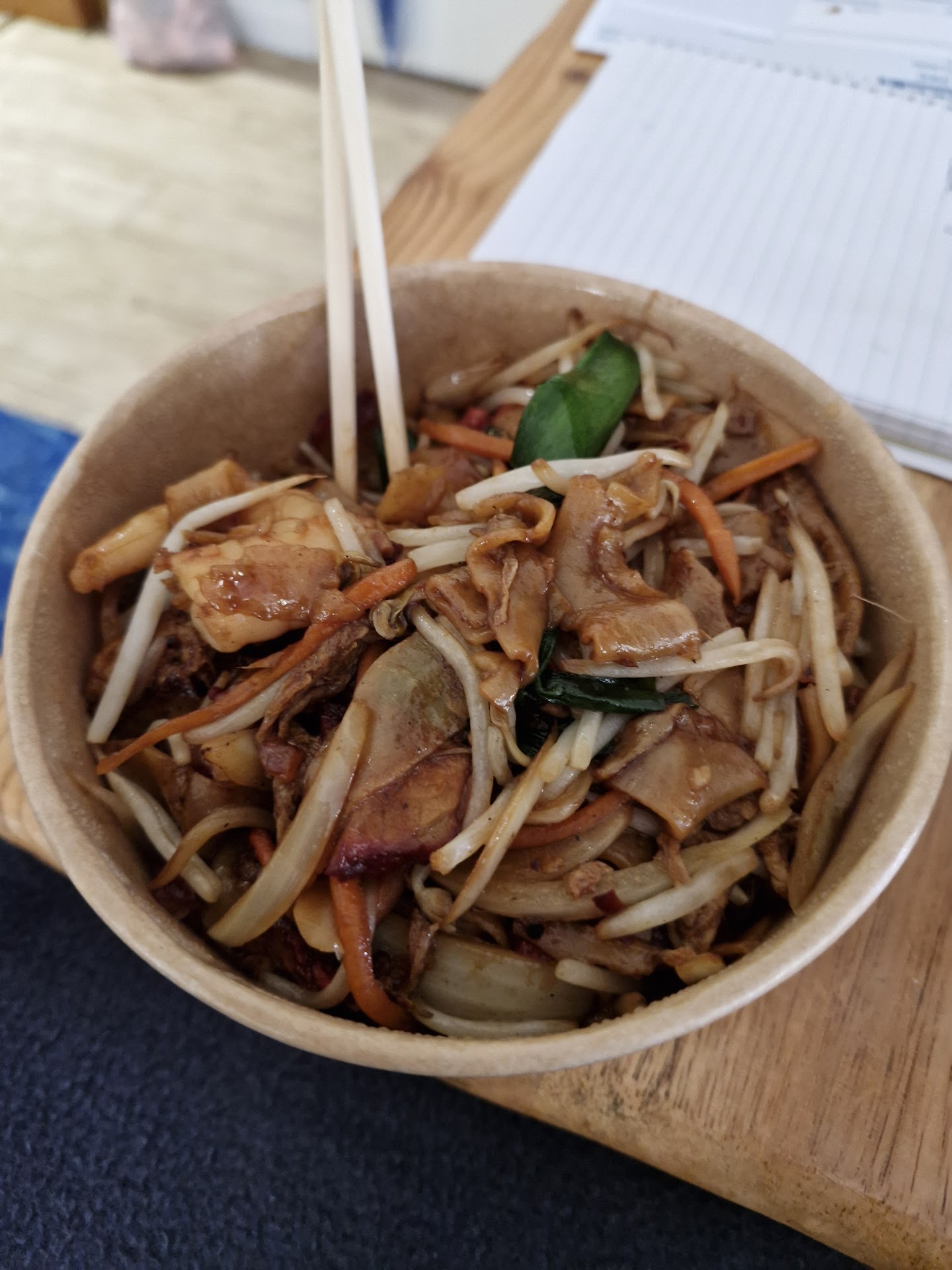 My husband chose "The Big Box," a large size consisting of egg noodles, chicken, pork, beef, veggies, bean shoots, and sauce. He chose the hot and spicy level of chilli. $14.80 I chose the Fried Kway Teow, small size mild chilly, consisting of flat rice noodles, pork, beef, prawns, veggies, and bean shoots and associated sauce. $12.80 We did takeaway and brought home to eat, but they do have a small eating area with tables and chairs.