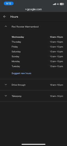Read moreIndifferent staff (five staff on at the time, three out of five doing absolutely nothing- one cooking, one doing drive thru. One dude with a long, curly 'fro flipping his majestic, unfettered locks about in the kitchen). Incredibly sticky floor- to the point that our shoes made noises like velcro ripping when we moved. We forgot to order sauce. My daughter waited at the counter, ignored for five uncomfortable minutes, while the girl serving flirted with an off duty staff member who had ordered food. They talked about other staff members and customers from their last shift. Should have cut our losses, but nooo- thought the time invested would pay off. It did not. My partner dipped a nug in sauce, but noticed two short hairs on it as he was about to pop it in his mouth. No one else wanted to continue eating. Yes- this was reported through Red Rooster via their QR code. Just go...