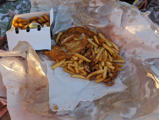 By the time we got our food, sunset had been and gone, like our visions of enjoying our dinner with a view. It was dark so we drove straight home cos we were starved. Wish I had taken a pic, but, we were too hungry and tucked str8 into the greasy, lukewarm disaster! Fish was overcooked, too firm and batter was a soggy, greasy mess, as were my smooshy tempura prawns. Chips were soggy, and unseasoned. I had to strip the batter off the pineapple fritters, cos by this point... I had reached my capacity for soggy, doughy mush...just gross! Get a decent dinner at one of the restaurants, nearby, where you can relax with table service instead of waiting anxiously for your number to be called when its 100...