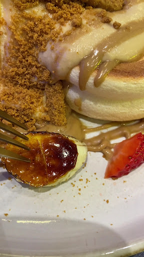 Read moreThis is such a well designed/run cafe! I ordered an Iced Strawberry Matcha and the new Caramelised Biscoff and Banana pancakes. My mum ordered the Crème Brûlée Pancakes. This wasn’t my first time ordering the Iced Strawberry Matcha, the first time it had pieces of Strawberry in it which I was NOT expecting, I nearly spat it out everywhere😭 But it was still very good!