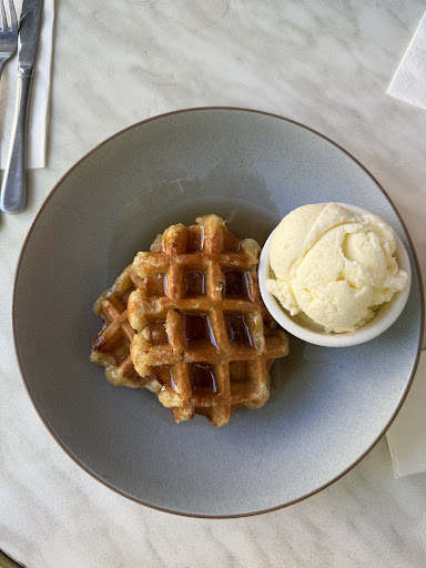 The fritters were crispy on the outside and soft inside, packed with fresh zucchini and corn, and beautifully seasoned. They were served with a light salad and a perfectly poached egg on top, making for a wonderfully balanced meal. The waffles were golden, fluffy, and served with a generous helping of fresh fruit and syrup – the perfect sweet addition to our meal.