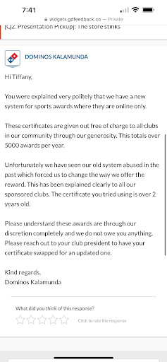 Read moreFURTHER UPDATE (because the rudeness from Dominos continues- see attached conversation)