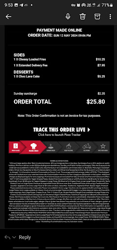 We ordered thin and crispy pizza but received thin and soggy pizza made from filo pastry!? What happened to making pizza with pizza doe? That is the first time I have ever eaten pizza made with filo pastry and I hope it will be the last, not a great experience. The base was oily and not crispy in the slightest. Pizza was delivered late but that’s ok, we wouldn’t mind if the pizza had been good but sadly it wasn’t. We won’t be ordering Domino's again unless something drastically changes with the quality of the pizzas. Bring back the New Yorker Range, ...