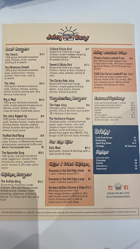 Think this place must have changed owners. Menu is smaller now and the burgers are no where near as good as they were before. But still have the old way better menu on thier online advertising which is annoying and misleading to begin with. Its very disappointing to talk up how great a place is to friends then take them there and its nothing like it was when it first opened or you remember.. Place is called juicy buns but the last two or three times i have been the potato buns have been the most stale i have ever been served if you are going to serve stale buns at least warm them up or toast them. No wonder its gone from being packed and busy all the time to not many customers there.. Hopefully things improve back to the quality it was. Sorry for the negative review but the lack of effort to update your menu online as well as repeated stale buns and the burgers seeming smaller now and not made with as much love is something i have noticed unfortunately and feel its something you need...