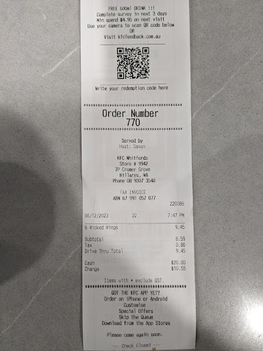 Read moreI'm not really the type of person to write a review, but today I waited 25 minutes for a meal inside KFC Whitford. I wasn't the only person having experienced extreme wait times either. Service was terrible. Staff and management seemed to be completely disorganised, though suprisingly, they also seemed indifferent to the massive group of people waiting for their meals. It was so bad that people who were arriving to place orders were leaving after staying in line for too long and not being served.
