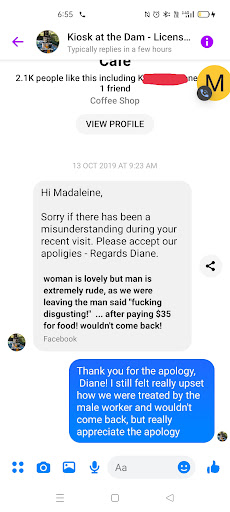 Read moreDo you ever walk into a cafe & wonder what you do next? Well that is what happened to us at the Kiosk at the Dam, no greeting, no acknowledgment, for that short awkward moment in time it was like we were not there. The gentleman & the lady seemed busy & focused, until finally the words were uttered, “You need to order over here” ah a greeting, we were at the wrong counter. I had notice nice size scones at the back of the counter we had come from, so selected that as our choice with cream and jam of course and two coffees. Service was prompt and our scones and coffee quickly arrived. Now we love morning tea as we travel and we know low price is around $16 & high is around $30, today we were a couple of dollars off the high. The cafe has everything and it’s in a great location, but looking at the other reviews, our visit was not their best. Tip greet your customers, it was quite nobody else in the cafe, could not understand...