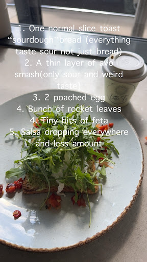 Let me start with the overpriced and tasteless food. However, the so-called "best-selling, I will sell 50 of them a day" brunch priced at 25 dollars was completely a joke. It only came with one piece of bread, two poached eggs, and a bunch of rocket leaves. To make it worse, the food had absolutely no flavor. I had to reach for the salt shaker just to make it barely edible, but even that didnât save it. The texture and taste were so unpleasant, it was truly disgusting, especially for a dish thatâs supposed to be a "best-seller."