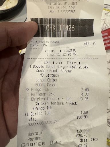After getting home and opening the items, the disappointment continued. The bondi burger was poorly made, after unwrapping it it basically fell apart. In addition, the chips weren't very fresh and the garlic sauce provided appeared to be a small tub of mayo with coarsley chopped pieces of garlic in it.