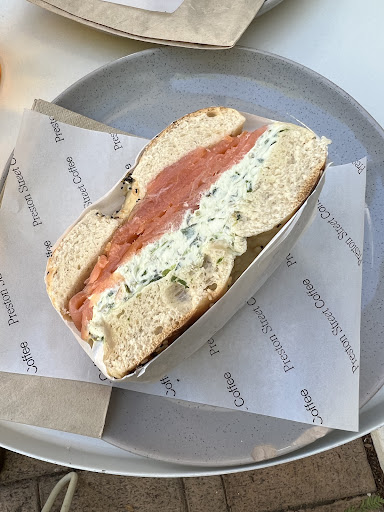 Service was great and both coffee and bagel fantastic. Salmon was fresh and the bagel lightly salted (which I quite like).