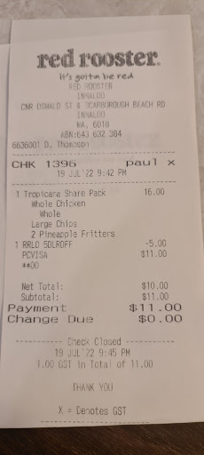 The food was great, but as a vegetarian, I couldn't help but feel like a potato out of water. I mean, the chips were delicious, but I needed something more than just spuds to fuel my veggie power. So, my only suggestion for the good folks at Red Rooster Innaloo is to consider adding some vegetarian options to the menu. Maybe some veggie burgers or falafel wraps? Just a thought.