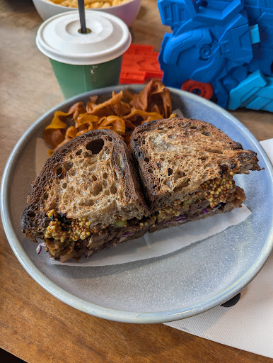 My friend ended up getting the chicken schnitzel sandwich which was delicious. It was very full with a good amount of sauce and the chicken was crispy. It also came with homemade sweet potato crisps . The drink she ordered was some fresh orange juice which went well with the sandwich.