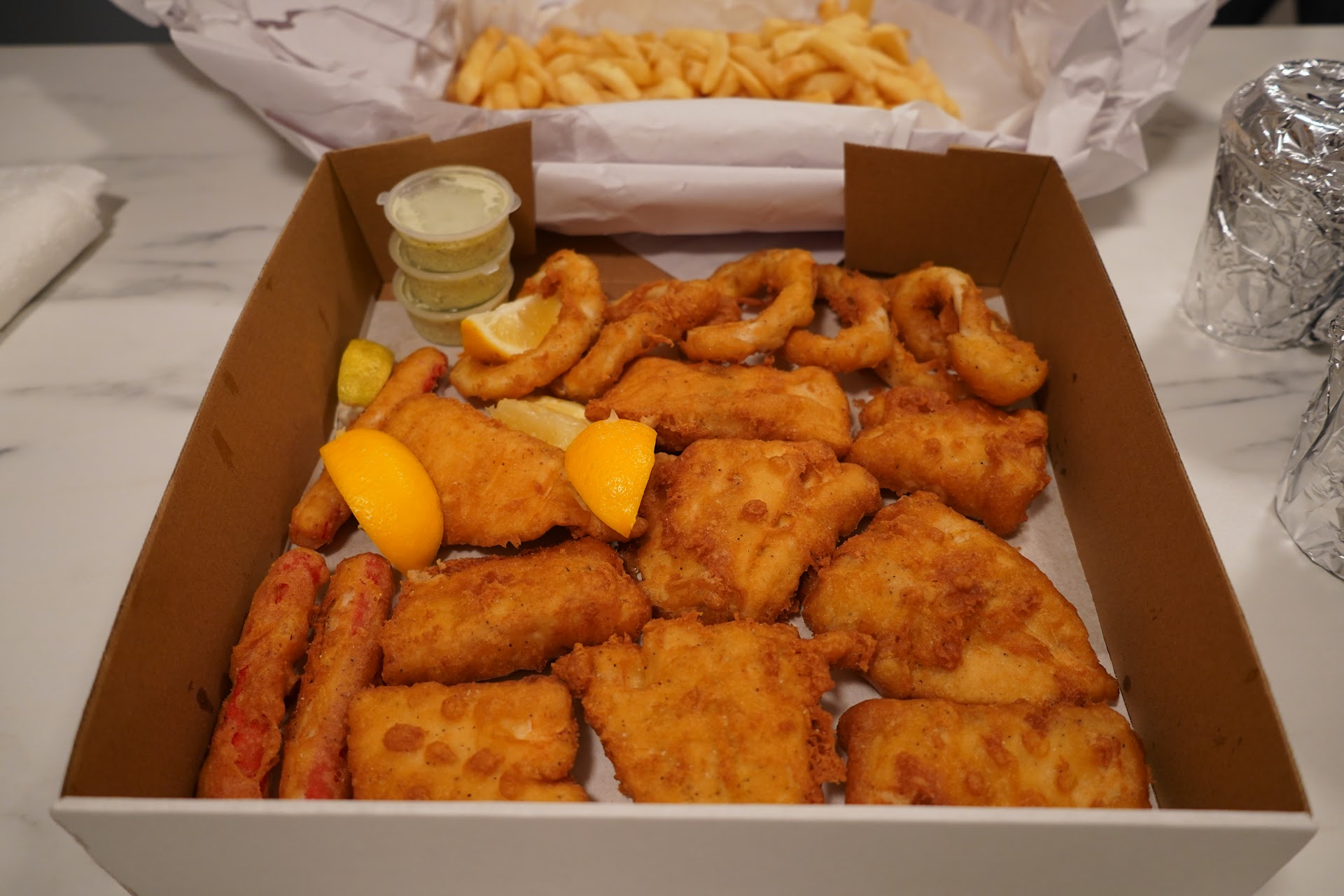 I eventually got my order at 5:25, nearly one hour later! It was stone cold, half a portion of chips, squid rings were chewy and very oily and did not reflect the money Iâd spent. It felt like the order had been sat waiting for a very long time without being called out. I spent over $40 and it wasnât worth it