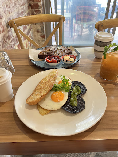 I arrived for lunch with my friend. He was at a table outside, but it started to rain. It was an uncomfortable situation when we asked to move to a table inside of the restaurant. A table for two was available, but a couple of women and a baby stroller made the chairs inaccessible. First impression: lack of consistency, disorganization. The table that they assigned us with some regret would have fit a group of 6 people. I understood. We sat on the side chairs so that there was space if another couple wanted to sit down. The coffee was served in take-away cups, even though we were there to dine in. I looked at the menus and placed my order at the cashier. The only fresh juice option “of the day” was carrot, celery, and something else written in a confusion board.The quality was questionable, but it had a nice presentation. My order came with an inedible pesto sauce, which ruined the flavor of the overcooked mushrooms. The quality of the bread was excellent, the light toasting made it crispy, but it could have had butter for the price of the dish. The pigeons came and went freely in the restaurant. It even had access to the open kitchen area. I would have turned a blind eye if the customer service was excellent, since I also work in hospitality. The cashier is on an island, next to it is the open kitchen and behind it are the bathrooms. All connected. I think it could benefit from some professional help to enhance and improve the mood of the restaurant. Including for the staff who work there. I saw they are embarrassed to be stomping pigeons through the door.