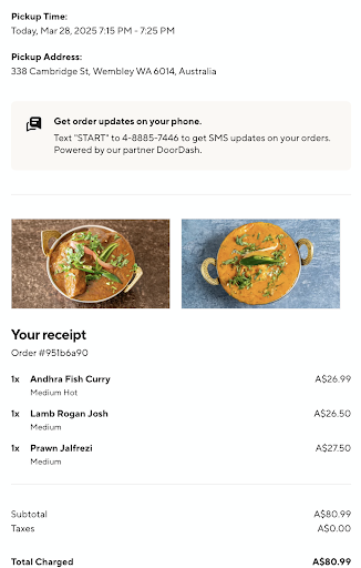 All the dishes were fairly mild, even the vindaloo and madras, but that wasn't a problem. Despite what others have said, we found the portions to be on the smaller side, and the rice and bread was massively overpriced. $8 for a "large" rice which was really only enough for two people is too much. For the curries, we had 5 dishes amongst 4 people and had some leftovers, which the waitress was kind enough to offer to pack to take home if we wanted. We didn't bother as it was mostly just sauce.