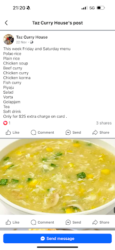 So we got to know from Fb they are serving buffet deshi dinner on Friday and Saturday for 25$ pp and they mentioned all the items name there with some reference pictures. We were so excited to have some Bangladeshi food at a restaurant after such a long time. A very clumsy environment with some really uncomfortable seating arrangement ruin our excitement in the very first minute we entered the place. Coming back to the food review, in one word ādonāt waste your hard earned 25$ to get stomach ache and weird smelly food.ā In the fb post it was mentioned they will serve chicken soup, chicken korma, plain rice, tea (picture added), none of these were served.