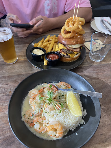 The food options were great. I ordered a burger that was huge and full of flavour. It could have used just a little more seasoning, but it was still delicious. The chicken wings in hot sauce were hands down the best Iāve ever had in my life. They were so good Iāve ordered them multiple times on DoorDash since eating here. Covered in sauce which is what you want, Thatās actually why Iām writing this review. My only suggestion is that the wings should come with blue cheese sauce, not just crumbled blue cheese as an option. It would make them perfect. I also had the creamy garlic prawns, which were absolutely amazing. The flavour was unreal, but the sauce was more buttery than creamy. I think it would be even better with more creamy garlic sauce to soak into the rice. It would also be a nice touch to include two poppadoms instead of one to help scoop up the rice and sauce.