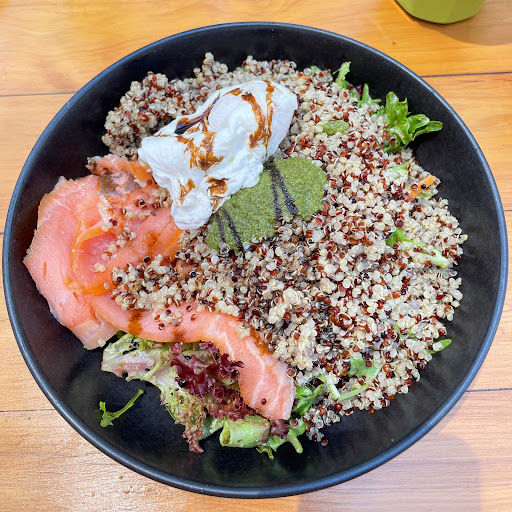 I ended up purchasing the bottled drink, which I still didnāt mind as it needed to cool down. I also ordered a quinoa salad bowl, with poached egg (but it wasnāt poached) it was rather stiff and possibly microwaved. But the pesto & salmon on the quinoa add flavour, I did quite enjoy it.