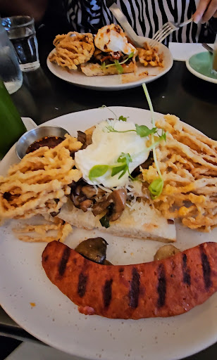 Was seated in private corner. Food came out fresh and aromatic. I ordered the Mushroom stack with a side of chorizo. The half cut chorizo was a bit steep for $5 but the taste with the mushroom stack was delicious!! I enjoyed. Every. Bite 🧡 Girls ordered pancakes & hubby ordered a big breakfast. Everyone was happy with their food and beverages.