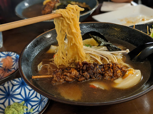 Ordered the edamame, vegetable and prawn tempura, garlic maki soba and grilled salmon sushi roll. Edamame was good, can't go too wrong with a simple dish like this. The tempura was fried up really well, presented well, taste was alright. The dipping sauce did not have radish in it - a staple in tempura dipping sauce for Japanese cuisine - neither was it provided as a side on the dish. Grilled sushi was presented very nicely however lacked in taste - was very one-dimensional. Had to request for soy sauce and wasabi because it wasn't served together with the dish. Garlic yaki soba was lacking in taste as well - also very one dimensional. Could barely taste the garlic taste and the beef was alright.