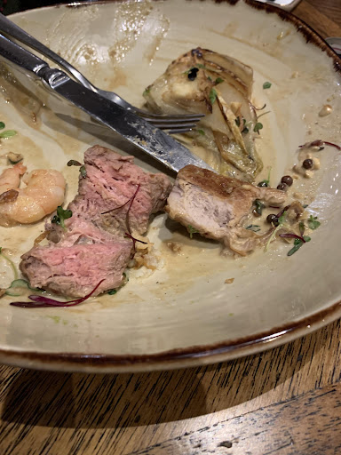 Read moreLet's start with the good... The homemade baked beans at the breakfast buffet were amazing! Best I've ever had. The burger special with thick cut chips and club sandwich on the bar lunch menu were fairly pleasant. Now the not so good. Dinner was awful. The limited menu with high end food items alludes to a fine dining experience, this was certainly not what we got! The steak was well overcooked and extremely tough. The Pork and Prawns was room temperature when it was served and was poorly cooked also. One of the pieces of pork was incredibly over-cooked and the other undercooked (see picture), yet both were again extremely tough! The scallops were overpriced and rubbery, again served at room temperature. The watermelon gel desert was a flavourless piece of jelly and the vodka infused watermelon that was meant to accompany this turned out to be vodka infused pineapple and was revolting! The restaurant was either understaffed or poorly managed. It took a long time after us arriving, to have our drink order and food orders taken. I asked for a wine list and was told they will bring one right over. 20 minutes later I ended up walking to the bar to get one. Over-all a poor dining experience. If you are eating there, stick to the all day bar menu and get something basic...