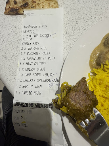 Firstly we asked for poppadoms initially, and sides to come out with mains, they ended up on table before our poppadoms and with no mains as asked, we didnât want to ruin anything by complaining at this point, little over an hour later our adult mains came out mine and my wifeâs only, we waited a little thinking the rest would come, 10 min passed nothing else the guy said wonât be long, we started to eat ours another 15 min later the kids food came out still nothing for the in laws, 10 more min later thereâs did arrive, Now to the food disgusting is an understatement everything was soooo hot, my 7 year olds korma was vile my tikka masala which was asked for as mild I couldnât taste anything except hot spice, onion Bahdji was covered in salt couldnât even eat them, when the guy asked how the food is I said il be honest we canât taste anything itâs just too hot there were literally no flavour, his response was to laugh and then ask if we would like any more drinks, bill was $200 normally I wouldnât be happy and would have said I wasnât paying but again it was my wifeâs birthday meal, We will never return here I felt generally sorry for the guy serving he was taking orders, bringing drinks serving tables wouldnât surprise me if he had been cooking the food too with how long it took,
