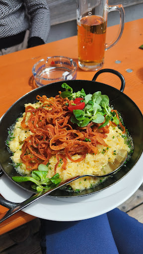 Read moreWir waren heute dort, an einem neblig- trĂŒb verregneten Tag. wenige GĂ€ste. Mein Mann iĂt fĂŒr sein Leben gern Kaiserschmarrn. Auf Almen und in vielen WirtshĂ€usern hat er schon Kaiserschmarrn gegessen, macht ihn sich auch selber gern daheim. Auch hier hat er sich einen bestellt. Mit Preiselbeeren im PfĂ€nnle fĂŒr ĂŒber 11 Eur. Doch oh je: so furchtbaren Kaiserschmarrn hat er noch nie bekommen: nicht locker, sondern batzig der Teig, auĂen nicht kross. Dicke Bollen mit um die 3 cm Durchmesser waren das, die man mit dem Messer schneiden muĂte. Die freundliche Bedienung brachte nach unserer Beanstandung eine weitere kleine Portion. Die war vielleicht fĂŒnf Minuten lĂ€nger in der Mikrowelle? So hat es jedenfalls geschmeckt: nicht frisch zubereitet, sondern aufgewĂ€rmt, oder alter Teig, ohne Eischnee, nicht fluffig. Mehlbatz. Meinem Mann ist davon auch noch schlecht geworden hinterher. Er hatte die nĂ€chsten zwei Stunden Bauchweh. Und kann bestimmt wochenlang keinen Kaiserschmarrn mehr sehen geschweige denn essen, weil ihm schon ĂŒbel wird, wenn er an seinen letzten hier denkt. Da hilft auch das nette Ambiente hier nichts. So etwas darf nicht auf den Teller. Lieber sagen, dass es lĂ€nger dauert und frisch zubereiten oder...
