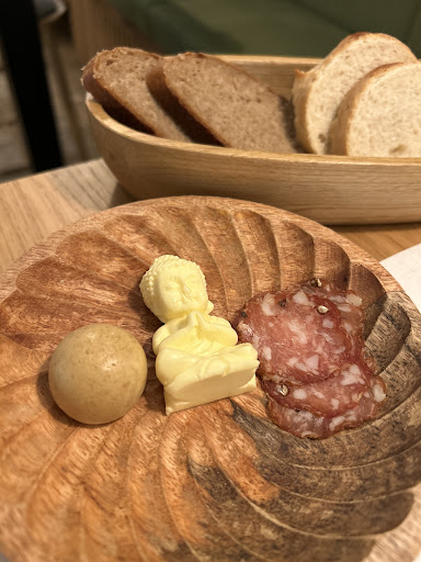 Das MenĂŒ begann mit einem Gedeck, bestehend aus 3 verschieden Brotsorten, Rohmilch-"Buddha", Wildpastrami und veganem Bratlschmalz (sensationell!).