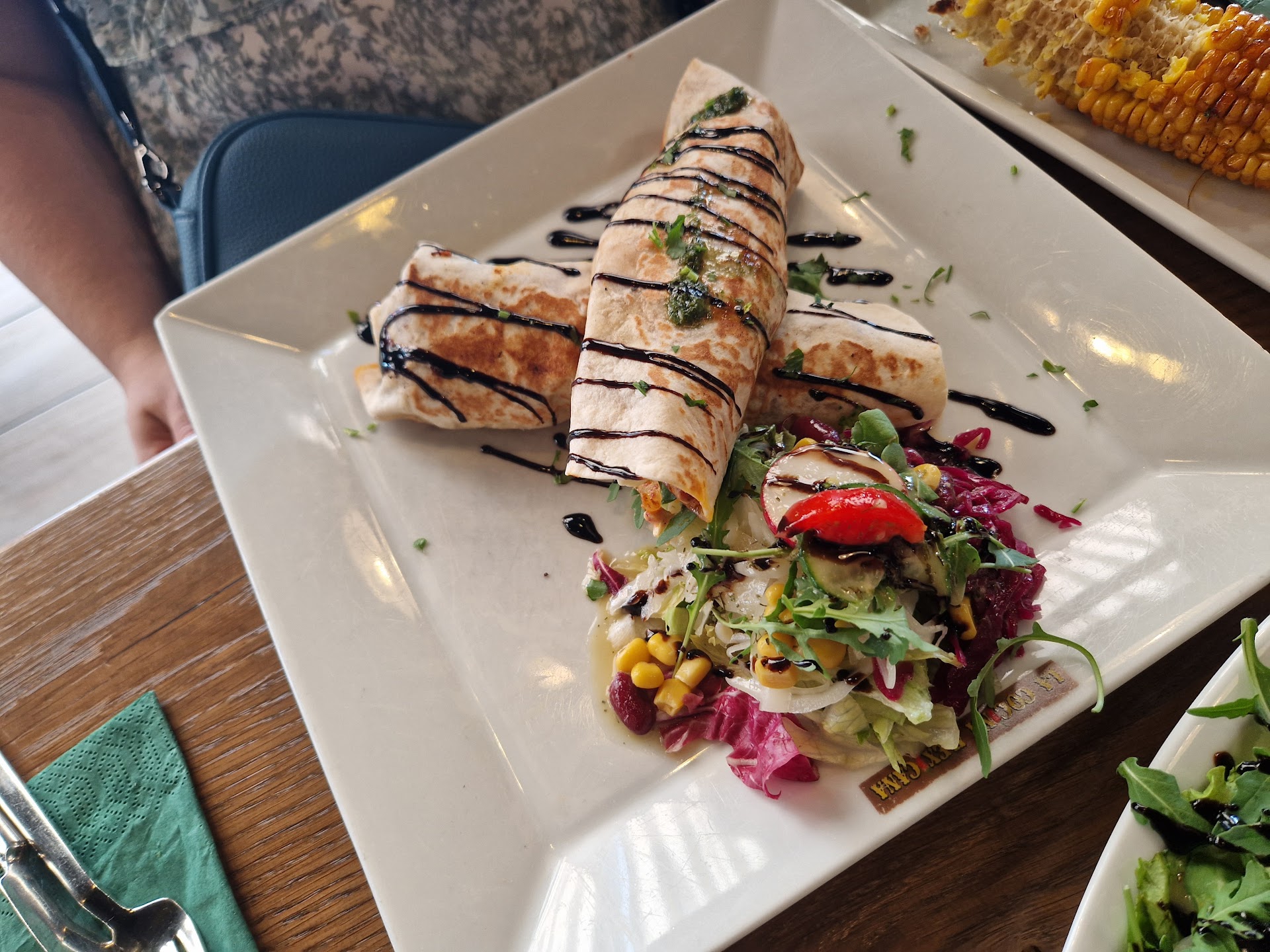 Ich hatte die Nummer 70 mit Geschnetzeltes Huhn und ich muss sagen es war einfach großartig. Das Fleisch war würzig, gut durchgebraten und passte perfekt zur weißen Sauce die dabei war. Als beilage Salat und Reis wobei sich der Reis mit dem gebratenen Gemüse kombinieren ließ. Meine Frau bestellte als Vegetarierin die Burritos mit Schafskäse und als Vorspeise einen Maiskolben mit Butter. Wir waren beide absolut angetan und werden dort auf jedenfall noch andere Gerichte probieren.