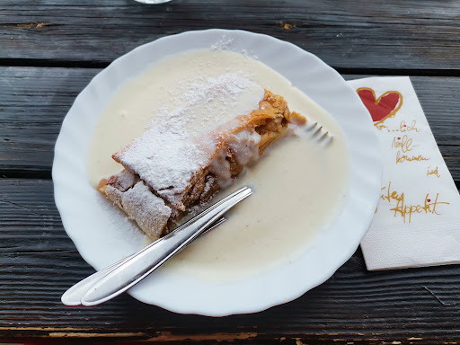 Fantastische Hütte zur Einkehr an einem Skitag - direkt am Ende der Skipiste 5, oberhalb des Lifts. Hier merkt man, dass man bei einem Anwärter für den Titel "Kärtner Genussgastronomie" ist. Draußen reichlich Tische, teilweise mit Heizer. SB-Bereich vorhanden, man kann am Fenster bestellen und wird dann aufgerufen, wenn das Essen fertig ist. Das geht in einer angemessenen Zeit und sowohl die Pommes als auch das Schnitzel (12,90€ mit reichlich Pommes und Ketchup, Mayo UND Preiselbeeren) waren frisch gemacht worden und richtig heiss. Das Fleisch kommt vom eigenen Hof (Bauernhof in Arriach) oder vom lokalen Metzger (oder Frierss, Villacher Metzgerei) und war fantastisch, die Pommes heiß und knusprig. Auch der dazu bestellte Most (=Apfelwein) war hervorragend und für die müden Oberschenkel genau richtig. Die Kolleginnen am SB-Fenster waren super nett, im Gegensatz zu sehr vielen anderen Hütten in Kärnten eine richtige Wohltat. Zum Abschluss gönnten wir uns noch einen warmen Apfelstrudel (eigentlich 4,50€, mit Vanillesauce aber 7,50€), der genauso wie die Vanillesauce sicher hausgemacht ist. Alles in allem das beste Hüttenerlebnis in 6 Kärtner Skitagen und ich bereue es, hier nicht schon früher gestoppt zu haben. Beim nächsten Mal sind...