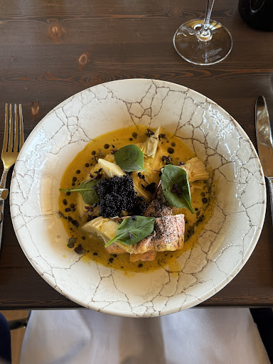 Das Gedeck kam fast gleichzeitig mit der Vorspeise. Die Vorspeise, die Leber, war viel zu viel und nicht gut, viel zu intensiv im Nachgeschmack. Die Suppe war das Highlight aber wurde einfach auf den Tisch gestellt in einem Krug und nicht eingeschenkt und war auch zu viel und wurde dann kalt. Die Trüffelpasta war auch wieder viel zu viel und absolut zu viel Butter. Das Fleisch war sehr gut weich und lecker aber wirklich schlecht angerichtet und sehr unangemessen für den Preis. Bei dem Fischgericht waren Fische und Soße geschmacklich überhaupt nicht aufeinander abgestimmt. Der Käseteller bestand aus zwei kleinen Stücken Käse wie aus dem Supermarkt mit zwei großen Klecksern Marmelade. Leider war das Menü für „Gänge“ eine komplett Katastrophe die Portionen waren unüberlegt und von der Größe nicht passend und auch nicht schön. Geschmacklich war eines von 7 wirklich überzeugend.