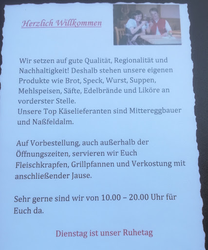 In der Jausenstation ist es sehr nett, die Aussicht über das Tal ist wunderschön und die Speisen sind bäuerlich, bodenständig und dabei sehr lecker. Auf Vorbestellung gibt es Fleischkrapfen und/oder Schweinsbraten - ich vermute man kann mit den Wirtsleuten auch andere Dinge auf Vorbestellung vereinbaren. Die Preise sind angemessen und völlig in Ordnung. Die Jausenstation selbst ist recht modern und neu, die Toiletten befinden sich im Untergeschoss und sind nicht barrierefrei zugänglich.