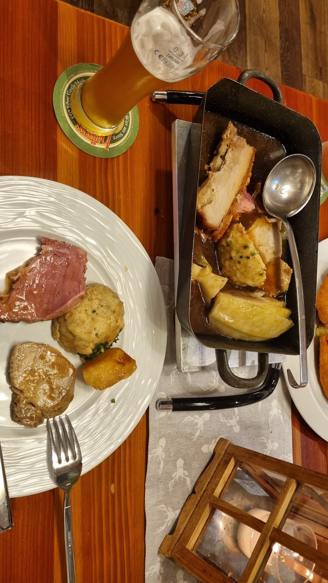 This is only about the restaurant. We (family with 2 teenagers) stopped at this wonderful old house and well-placed restaurant with the lovely view of the Traun river as a result of a sudden decision and we were only given a table because one of the guests who reserved did not show up. So obviously the place is very popular. From that point on it was pure disappointment for us. We have been to several restaurants in the area, always very happy but here there seemed to be too much glamour and in our opinion unjustified high prices with little joy involved. In our opinion the design of the menu itself is terrible. Full of descriptions and pictures but extremely messy. It was difficult to find out what is what. The food was OK but definitely not more than that, nothing special, really, and as far as the deer goulash is concerned it was tasty but I remained hungry afterwards, all this for prices much higher that other places where the choice was better, food was tastier and portions were perfect for young and not so young alike. The Hallstattbier was really great though. Our waiter was correct but very serious and not kind at all, although the young ladies who actually brought us the drinks and food were really nice and smiling. Bottom line, as far as we are concerned: We would appreciate more content rather...