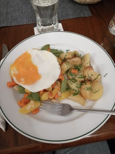 I think it's the first time that I'm writing a poor review in my life, and the only good thing of the all experience, was that we laughed so hard about the whole thing. First of all, as we walked in, we could see two dogs strolling in the kitchen so sanitary wise, I didn't feel super comfortable. We sat outside, with other clients, but we waited for more than a half hour only to order some drinks and food. After that, the drinks came quickly but we waited for an hour and a half to receive the food... only to receive something we hadn't ordered. My friends asked for vegetarian omelettes which came with ham... and on the menu, it was written it'd be served with a salad and potatoes which were completely forgotten. We just had a lame ham omelette on a plate... that's all... after more than an hour an a half... we complained and received a cheese omelette (finally!) but still with nothing else on the plate. I had ordered the grilled vegetables with the egg and potatoes and I must say it's the most pathetic dish I've ordered at a restaurant in my whole life... The veggies were barely defrosted, the egg cold and the quantity was not enough at all. They gave us one piece of bread for three people, which we eventually paid when we left... Friends who had came before told us it varies often and you never know what you'll get... On top of that, every staff member were quite drunk, which would explain why they kept forgotting us... They kept taking shots and drinks with the clients around us, which made us quite uncomfortable. Anyway, what a night to remember that we'll never...