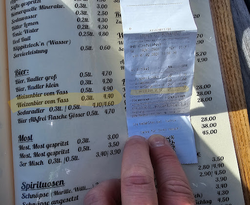 Hier gibt's preislich Abweichungen zur Speisekarte und das Weißbier wird (bewusst) nicht bis zur Markierung befüllt.
