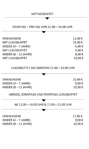 Read moreSehr gutes Buffet. Sushi im Buffet mitenthalten. Wasabi frisch und scharf so wie es sein soll. Der rohr Fisch und die Riesengarnielen richen frisch und werden auf Eis kalt gelegt. Die Saucen Auswahl lässt keine Geschmäcker offen. KNOBLAUCH, KOREANISCH, JAPANISCH und natürlich die China Saucen sind mit Spangen die man an das Teller befestigt WÄHLBAR. Ente, Rind, Schwein, Huhn, Garnelen, Fisch und Muscheln sind roh aus der Theke zu entnehmen und auf LEERES Teller mit ausgewählter Soucenauswahl zu legen. Man muss nur noch auf die Speise warten die in der Küche gebraten wird. Im Normalfall bediene ich mich in dieser Zeit am Buffet mit 8 Schätze. Mein Geheimtipp ist die Ente mit Zwiebel und Gemüse. Als Nachspeise stehen zur Auswahl wie Kuchen, Schokodonuts, Kokoskugeln mit Rum, Eis [Pickler Art] und Erdbeer Schnitte. Das Personal ist sehr Kinderfreundlich. Wer der Küche dank aussprechen möchte so gibt es dort bei der Theke [ Sicht zur Küche] eine Kasse für das Trinkgeld das direkt an die Köche geht....