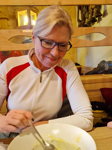 Great positioning with views to the Hohe Salve. Super sunny if you are lucky on the day. Self service was efficient. We had the fitness salad which was massive with excellent herby turkey breast. Nice atmosphere, I would recommend a stop. My wife walked up to meet me there from Brixen, so a good option for walkers too, she caught the gondola back down to save...
