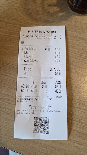 Wir waren 10 Tage zu Urlaub in Brixen im Thale und in guter Tradition wurde zunächt am Ankunftstag die örtliche Pizzeria besucht. Das Ambiente...naja, hier wurde kein einziger Euro in eine Wohlfühlatmosphäre gesteckt...egal. Dann wollten wir Getränke bestellen! Da die kleine Cola Light mit 4 Euro heftig hochpreisig erschien, haben wir gleich die größere Variante für knapp 5 Euro geordert. Was brachte uns die Wirtin..kleine Getränke in der Flasche. Wir monierten, wir möchten große Cola light, wie in der Speisekarte angeboten "Haben wir nicht" hieß es lapidar, wir erwiderten, laut der Speisekarte doch. "Nein das stimmt nicht", so wird man als Gast quasi der Lüge bezichtigt. Die Krönung war, das die Wirtin sich weigerte, in ihre eigenen Karte zu schauen und den offensichtlichen Fehler zuzugeben. Statt uns dann einfach mit Hilfe einer dritten Flasche die bestellte Gebindengröße zu servieren ,wurde es richtig unfreundlich ,was wir denn eigentlich wollten.... Der Ärger wurde runtergeschluckt und die völlig überteuerten kleinen Getränke akzeptiert, da wir einen Reisetag in den Knochen hatten und keine Lust, denn Laden gleich rückwärts zu verlassen ,(was verdient gewesen wäre). Dann kam die Pizza....geschmacklich noch leidlich o.k. ,wobei die Größe angesichts der Preise (wie in Kitzbühel auf der besten Meile im Edelrestaurant) sehr übersichtlich ausfiel. Das einzig positive am Aufenthalt in dieser Pizzeria war die dunkelhaarige Bedienung (eben nicht die Wirtin) , diese war erwartungsgemäß freundlich. Wir sind daher natürlich zum letzen Male in dieser Pizzeria gewesen und der gegenüberliegende Brixenwirt mit schönem rustikalem Tiroler Ambiente wurde unser Stammlokal mit großen Portionen zu angemessenen Preisen. (für üppige Fleischgerichte günstiger als eine mäßige Pizza bei Massimo) Der Beste Witz ist, das dort die kleinen Softdrinks für 2,30 Euro angeboten werden, also fast für die Hälfte des Pizzeriapreises. Daher kann man nur warnen, auf diese völlig überteuerte Imbissbudenatmosphäre...