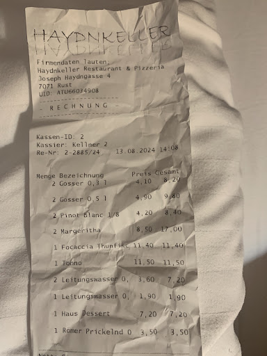 Read moreIch kann keine Sternenbewertung abgeben. Die Kellner mit nicht beherrschen der deutschen Sprache waren hektisch unfreundlich arrogant. Wir waren zu zweit, bestellten je ein Bier und je eine Pizza mit Rucola. Diese auch relativ rasch serviert, aber nur eine Pizza korrekt wie bestellt mit Rucola und eine komplett falsch, eine Pizza Tonno. Ich reklamierte die Pizza, nach längeren südländischen Gehabe wurde die Pizza vom Kellner mitgenommen, nach einiger Zeit kam der Kellner mit seinem Kollegen stritten an unserem Tisch was daran falsch sei und stellten mir die Pizza Tonno wieder vor die Nase; ich verneinte diese und die Kellner rauschten mit der Pizza wieder ab und wieder kam der Kellner mit der Pizza in Begleitung seines Chefs um mir die Pizza Tonno zu servieren. Wir haben den Prozess abgebrochen und diesen Ort, man kann dies nicht als Lokal bezeichnen, verlassen. Wenn die Stadt Rust auf ihre Reputation achtet, sollte diese auch ein Augenmerk auf ihre Lokale legen. Es steht für mich und vielen der Schreiber der Rezessionen fest, dass diese Betriebsführung vom Haydnhof, Rust...