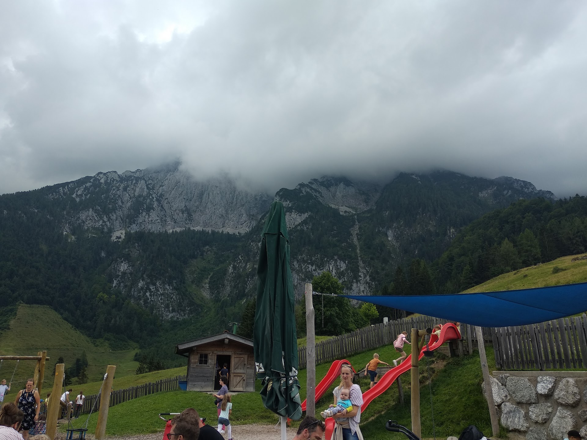 Wir waren um ca. 17:30 Uhr dort und es war noch nicht all zu viel los. Da gutes Wetter war, setzten wir uns nach draußen mit hervorragendem Blick auf das Bergpanorama. Die Getränke kamen recht schnell. Anschließend haben wir Essen bestellt. Speckknödel, Schnitzel, Käsespätzle und Kaiserschmarren.