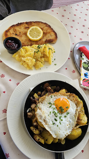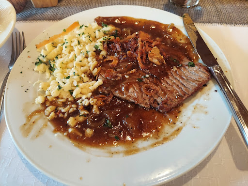 Went to lunch at this Restaurant near the Achensee in Tyrol Austria. Ordered ZWIEBELROSTBRATEN, which is a beef roast cooked in lots of onions. It was served with SPAETZLE noodles. There was also a side salad made with green lettuce, coleslaw and cucumber salad. Everything was very tender and delicious. I had a HEFEWEIZEN beer with it and an ESPRESSO after the meal. The portions are huge, so bring a really good appetite to be able to finish it all. My partner ate a CHICKEN SALAD with breaded chicken cutlets on a large mixed salad and she finished her meal with a Cappuccino.