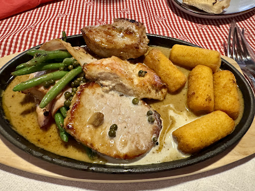 Aber wir waren ja wegen des Essens hier. Und das war wirklich sehr lecker. Das Wiener Schnitzel bestellten wir mit Pommes und waren begeistert vom Geschmack. Das Fleisch bei den anderen Gerichten war ebenfalls schmackhaft, das Schweinefilet lag jedoch mehrere Minuten zu lange in der Pfanne und war dadurch etwas zu trocken für meinen Geschmack. Saucen, Beilagen sowie Salat und Knoblauchbrot waren einwandfrei. Wenn überhaupt ist als kleiner negativer Punkt zu erwähnen, dass die Portionen auf dem Teller etwas kleiner als erwartet waren, wodurch die Kosten pro Person etwas höher wurden, da auch noch ein Eis zum Nachtisch nötig war.