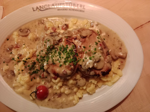 5 of us went this week to spend an evening here for dinner. When we arrived for our 6:00 PM reservation, the place was still quite empty, but as the evening went on, more and more people filed into the large restaurant. We ordered dinner and it was delivered pretty quickly. I had ordered a steak with onions and bacon bits, with a side of house salad and bread. 2 other people from our group had chosen pork cutlet (Schnitzel) with cream sauce and one person with french fries and the other with Spaetzle noodles. Another person ordered the burger with fries. Everyone of our meals was very good. The meat was fresh and prepared just perfectly. I had not been back to this place for several years, but I will definitely put it back on my radar and come visit again soon. Our waiter Sasha was very friendly and attentive. He and his helpers frequently visited our table to ask if we needed anything else and we gladly obliged. Right downstairs there is a brewery where they brew their own "Achensee Bier" I am not much of a Beer drinker, but I had to try at least a small glass, just like all of us did, and I must say it was delicious. Thank you for a lovely (and lively evening) with friends and family....