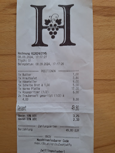 Wir sind dahin gegangen wegen die vielen tollen Bewertungen - aber nie mehr! Wir empfehlen alle "Augen auf" und Achtung aufs Rechnung! Als erstes wird keine Kreditkarte akzeptiert; nur Bar. Wir zahlen immer mit Kreditkarte. Es war eine Glück das wir 50€ noch hatten. Habe die Rechnung fotografiert um bei Bewertung dabei sein. Leider hatten wir Stress wegen der Bahn noch erwischen - und der Wirt hat es bemerkt und ausgenutz! Butter für 1€ (das wir nicht gegessen haben); dann ist Brot gebracht, jeder Scheibe 1€ ! Normalerweise gehört Brot dazu. Krautsalat sind mitgebracht - bestellt haben wir es nicht. Die beiden Traubensaft waren nicht gespritz und statt 2€ jeder, hat er 4€ gerechnet. Wir hatten eine "Zwilingstelller" für 13€ bestellt; auf Rechnung war irgendeine "warme Platte " für 17€. Und unsere Sohn hatt eine Rosespritzer für 3€ bestellt; verrechnet wurde 6€ !!!! Wir waren schon in verschiedenen Buschenschänke in Burgenland - und ganz besonders empfehlen wir der Buschenschank Wolffshütte in Heiligenbrunn - aber so was wie hier erlebt! So eine Ausbeutung! Wir sind immer noch unter...
